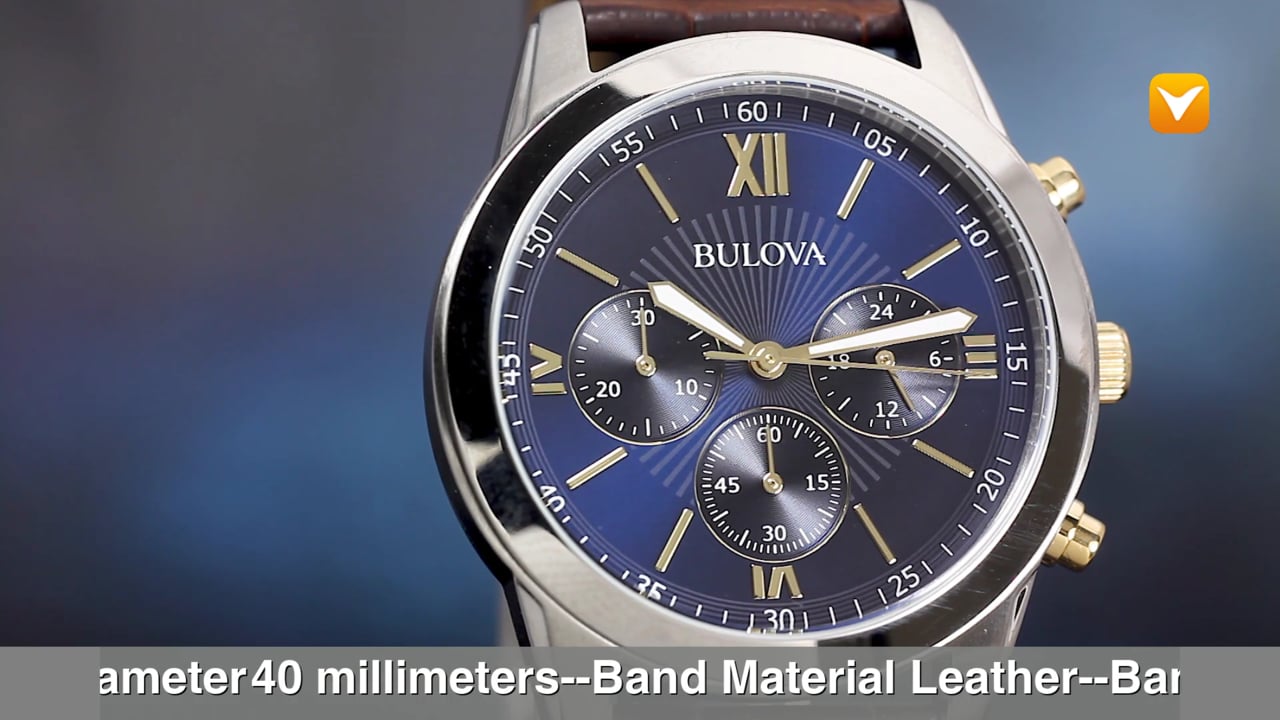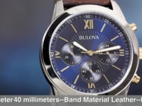 | Bulova Gent's 40mm Chronograph Stainless Steel Blue Dial with Gold Accents Brown Leather Strap. Price: $189 | ||