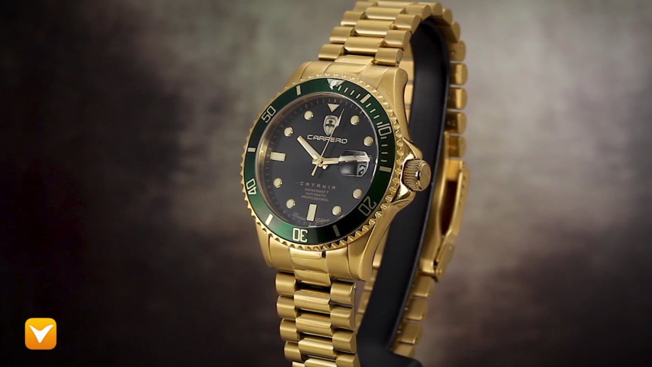 Carrero Limited Edition Catania Diver Automatic Gold Tone Black Dial Green Bezel. Price:
