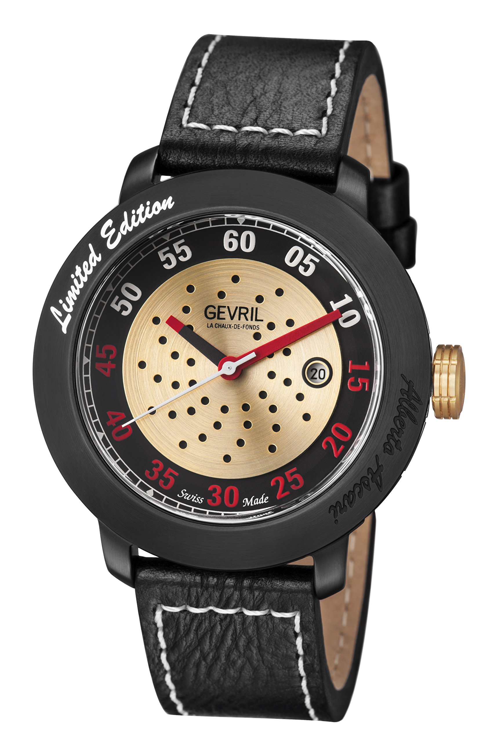| Gevril Men's 'Alberto Ascari' Swiss Automatic Stainless Steel and Leather Casual Watch, Color:Black (Model: 1102). Price: $795 | ||