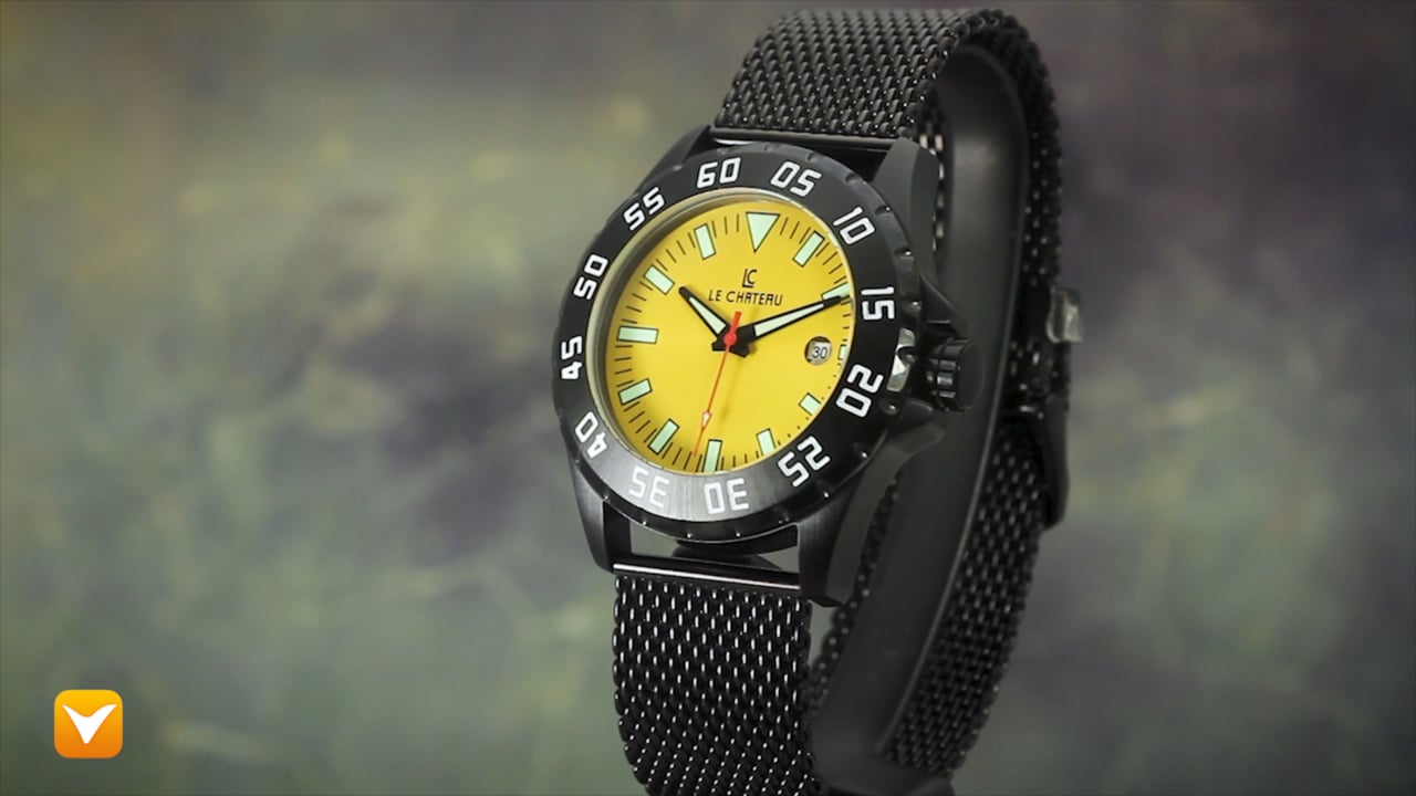 | Le Chateau 21 Jewel Automatic Black IP Yellow Dial Black Mesh Band. Price: $199 | ||