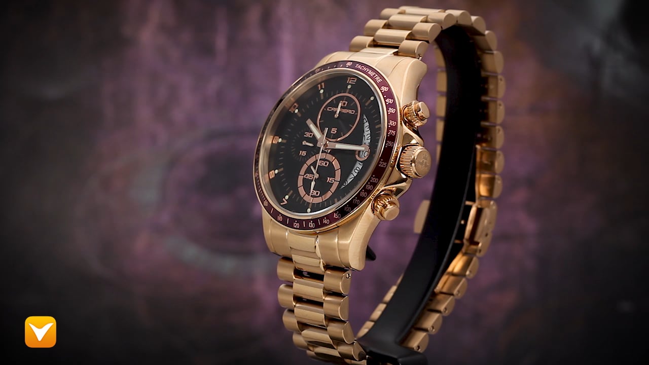 | Carrero Limited Edition Catania R1 Swiss Chronograph Rose Gold Black Dial Purple Bezel. Price: $349 | ||