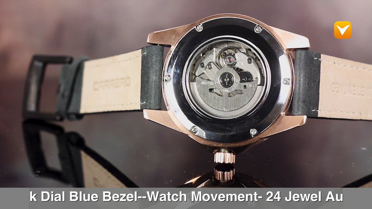 | Carrero Submersion Limited Edition Auto Rose Gold Black Dial Blue Bezel Glassback Black Leather Strap. Price: $399 | ||