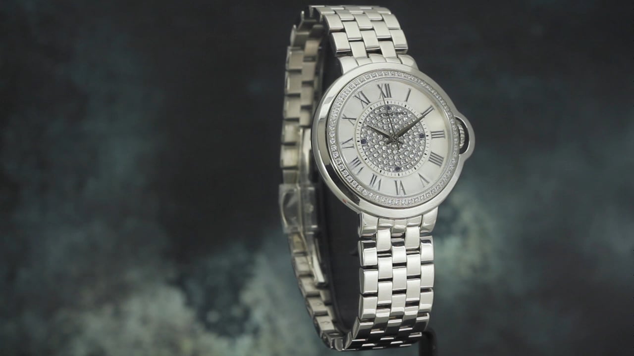 | Watch Details •Crystalite Stones : All Hand-Set-160settings (100 on the dial and 60 on the bezel) •Movement: Swiss Ronda •Case Measurements: 38mm •Thickness: 10mm •Case Material: Stainless Steel •Bezel: Stationary •Crystal: Scratch Resistant Harden Mineral •Dial Color: Silver •Crown: Push Pull •Band: Stainless Steel •Band Measurements: 7-7/8 inches L x 18mm W •Clasp: Deployment •Water Resistant: 5 ATM - 50 meters - 165 feet |