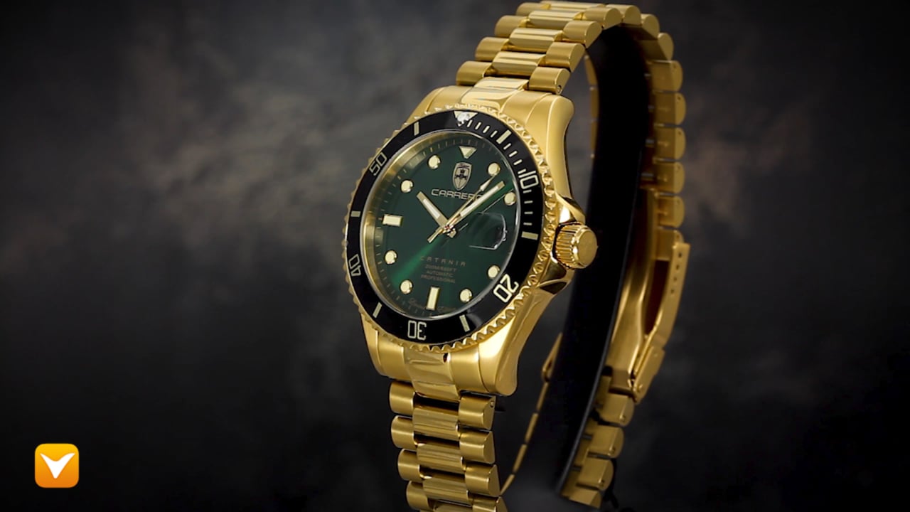 Carrero Limited Edition Catania Diver Automatic Gold Tone Green Dial Black Bezel. Price: