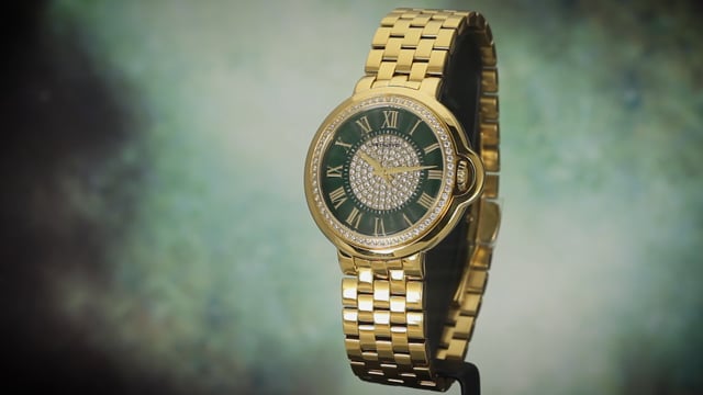 | Watch Details •Czet Crystalite Stones : All Hand-Set-160settings (100 on the dial and 60 on the bezel) •Movement: Swiss Ronda •Case Measurements: 38mm •Thickness: 10mm •Case Material: Gold Layered on Stainless Steel •Bezel: Stationary •Crystal: Scratch Resistant Harden Mineral •Dial Color: Green •Crown: Push Pull •Band: Gold Layered on Stainless Steel •Band Measurements: 7-7/8 inches L x 18mm W •Clasp: Deployment •Water Resistant: 5 ATM - 50 meters - 165 feet |