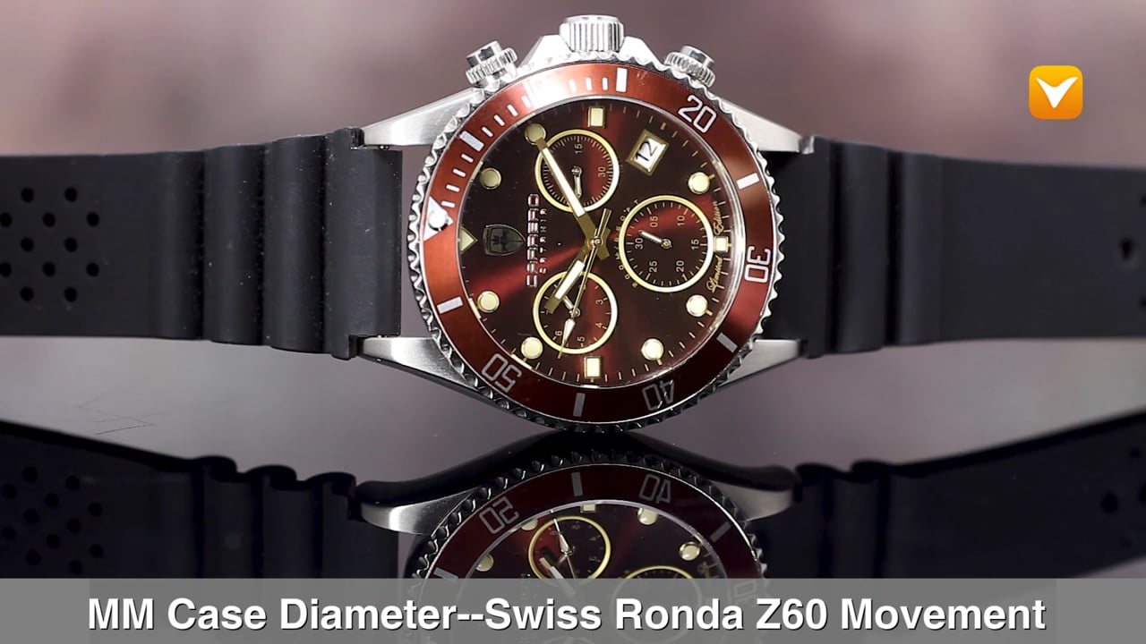 Carrero Limited Edition Catania Diver Swiss Chronograph Stainless Steel Maroon Dial Maroon Bezel Black Silicon Strap. Price: