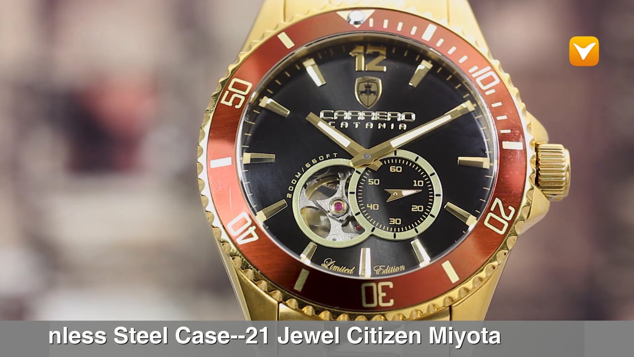Carrero Limited Edition Catania Diver Automatic Heartbeat Gold Tone Black Dial Maroon Bezel. Price: