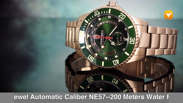 | 46MM Case Diameter 12mm Case Thickness Uni Directional Ceramic Bezel Stainless Steel Band Band Length: 9 inches 29 Jewel Automatic Caliber NE57 200 Meters Water Resistance |