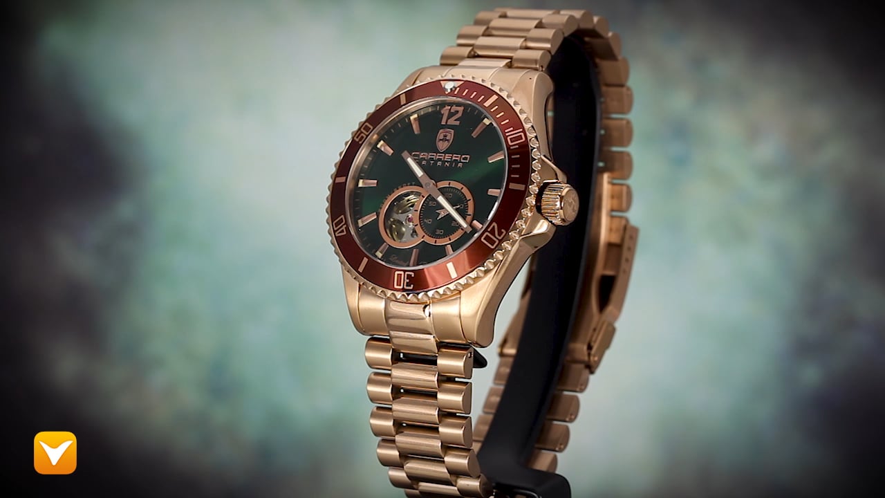 Carrero Limited Edition Catania Diver Automatic Heartbeat Rose Gold Green Dial Maroon Bezel. Price: