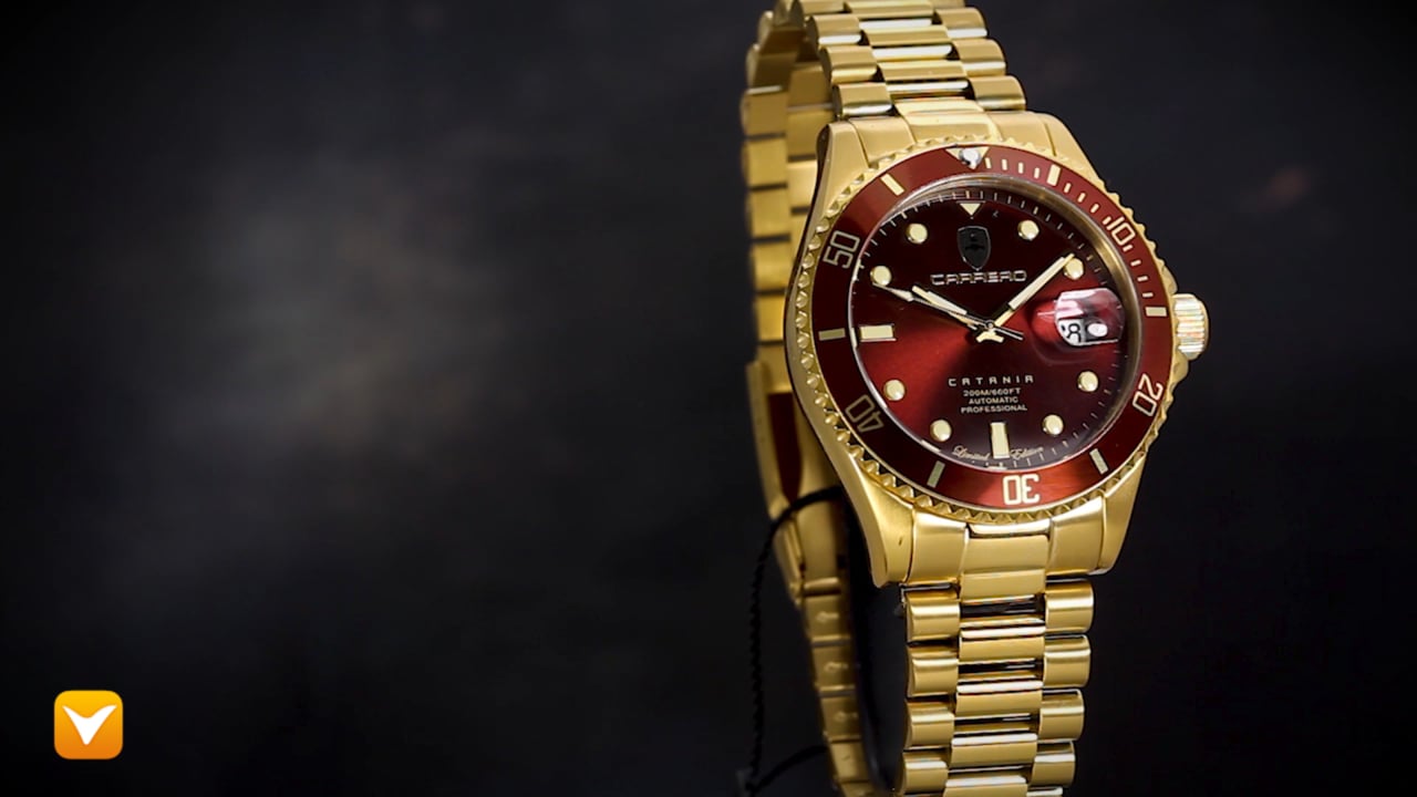 | Carrero Limited Edition Automatic Catania Diver Gold Tone Maroon Dial. Price: $369 | ||