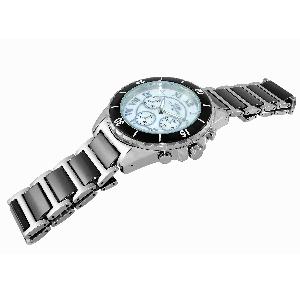 | Watch Details •Movement: Chronograph Quartz •Case Measurements: 46mm •Thickness: 13mm •Bezel: Unidirectional Rotating •Crystal: Mineral •Crown: Push/Pull •Dial Blue MOP Dial •Bracelet: Ceramic and Stainless Steel •Bracelet Measurements: 7-3/4 inches Length x 22mm Width •Clasp: Deployment •Water Resistance: 5 ATM - 50 meters - 165 feet |