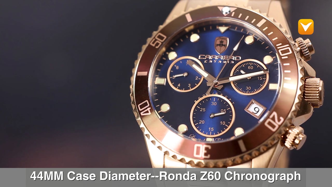 Carrero Limited Edition Catania Diver Swiss Chronograph Rose Gold Blue Dial Brown Bezel. Price: