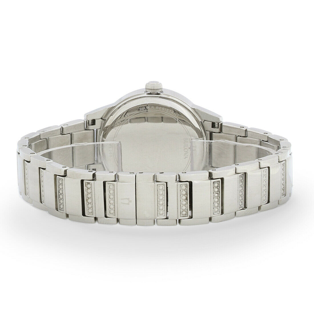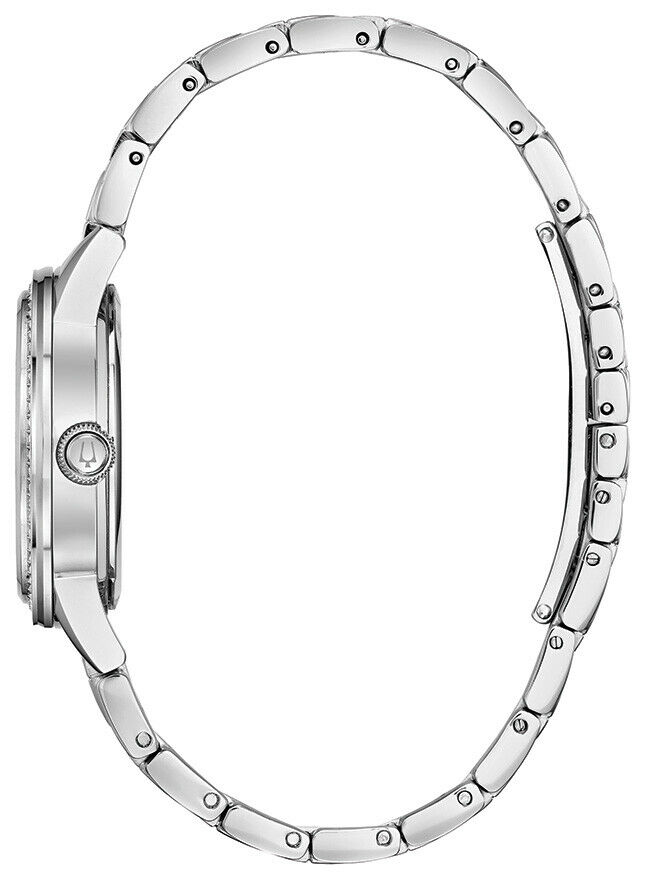 | Brand Collection - Bulova Item Shape - Round Dial window material - Mineral Display - Analog Clasp -- deployment clasp Case material - Stainless steel Case diameter - 32.5 mm Case Thickness - 9.2 mm Band Material --Stainless steel Band length - Women Standard Band width -16 millimeters Band Color - Silver Dial color - Blue Mother of pearl Bezel material - Stainless steel Bezel function - Stationary Item weight - 3.20 Ounces Movement - Quartz Water -100 Feet |