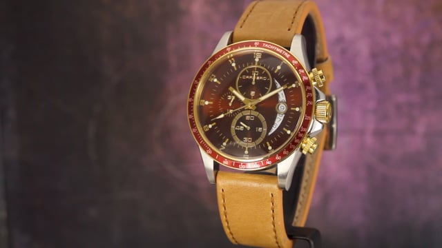 | Carrero Catania R1 SE Limited Edition Swiss Chronograph Two-Tone Burgundy Dial Burgundy Bezel Tan Strap. Price: $349 | ||