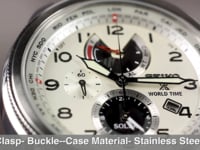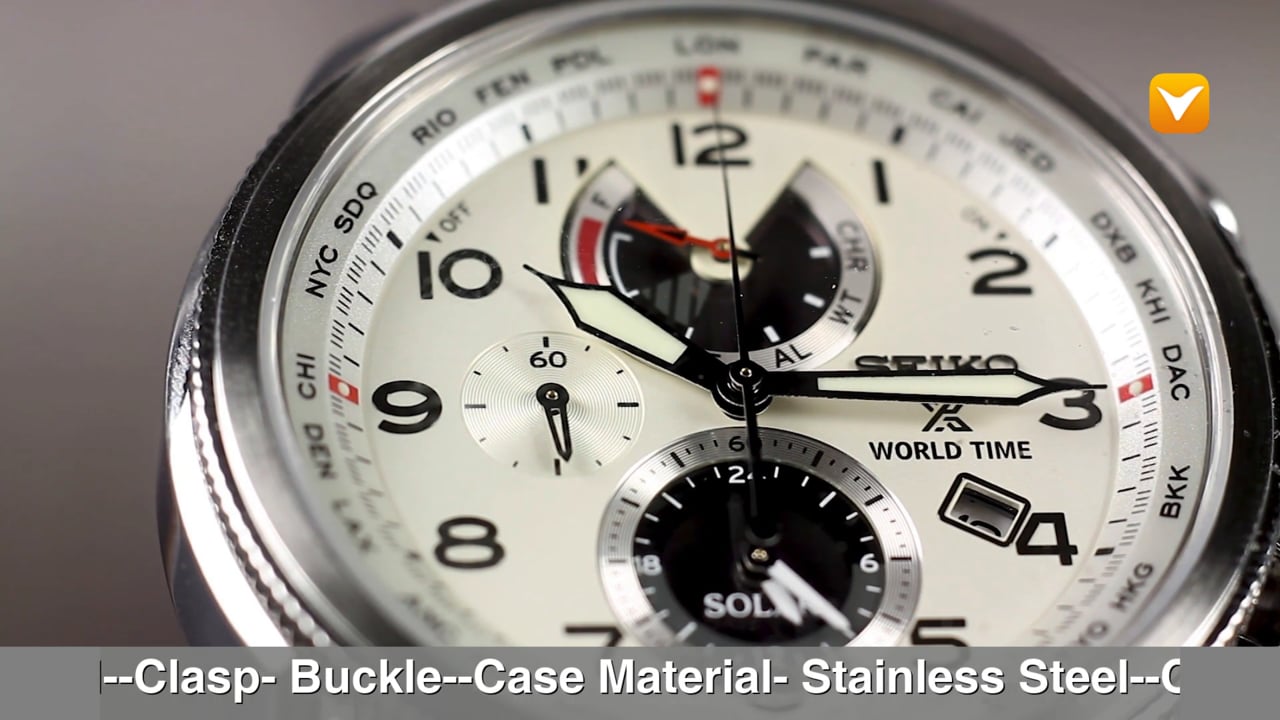 | Item Shape: Round Crystal: Sapphire Crystal Clasp: Buckle Case Material: Stainless Steel Case Diameter: 42 millimeters Case Thickness: 12 millimeters Band Material: Alligator Leather Band Length: Men's Standard Band Width: 22 millimeters Band Color: Brown Dial Color: Cream Calendar: Date Movement: Solar Caliber V195 Special Features: World Time, Date, Solar Water Resistant Depth: 100 Meters |
