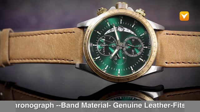 | Carrero Catania R1 Limited Edition Swiss Chronograph Two-Tone Green Dial Gold Bezel Tan Leather Strap. Price: $349 | ||