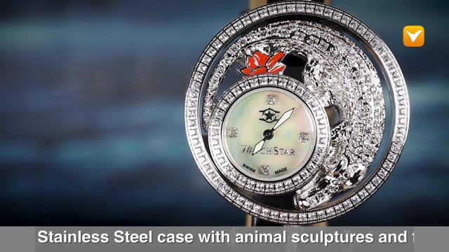 | Feature with SOP 656 EBS Swiss movement -- Limited Edition of 500pcs -- 42mm Dial -- 316L Stainless Steel case with animal sculptures and flower designs accented with hand-set Swarovski Zirconia for a unique and spectacular aesthetic -- jewels are 57 facets, diamond cut to meet GIA standard -- A petite mother-of-pearl dial sits off-center in the open case -- sapphire crystal -- Genuine diamond markers -- 20mm color coordinated satin topped leather strap fitting up to an 8.5” wrist, and 100M water resistance. |