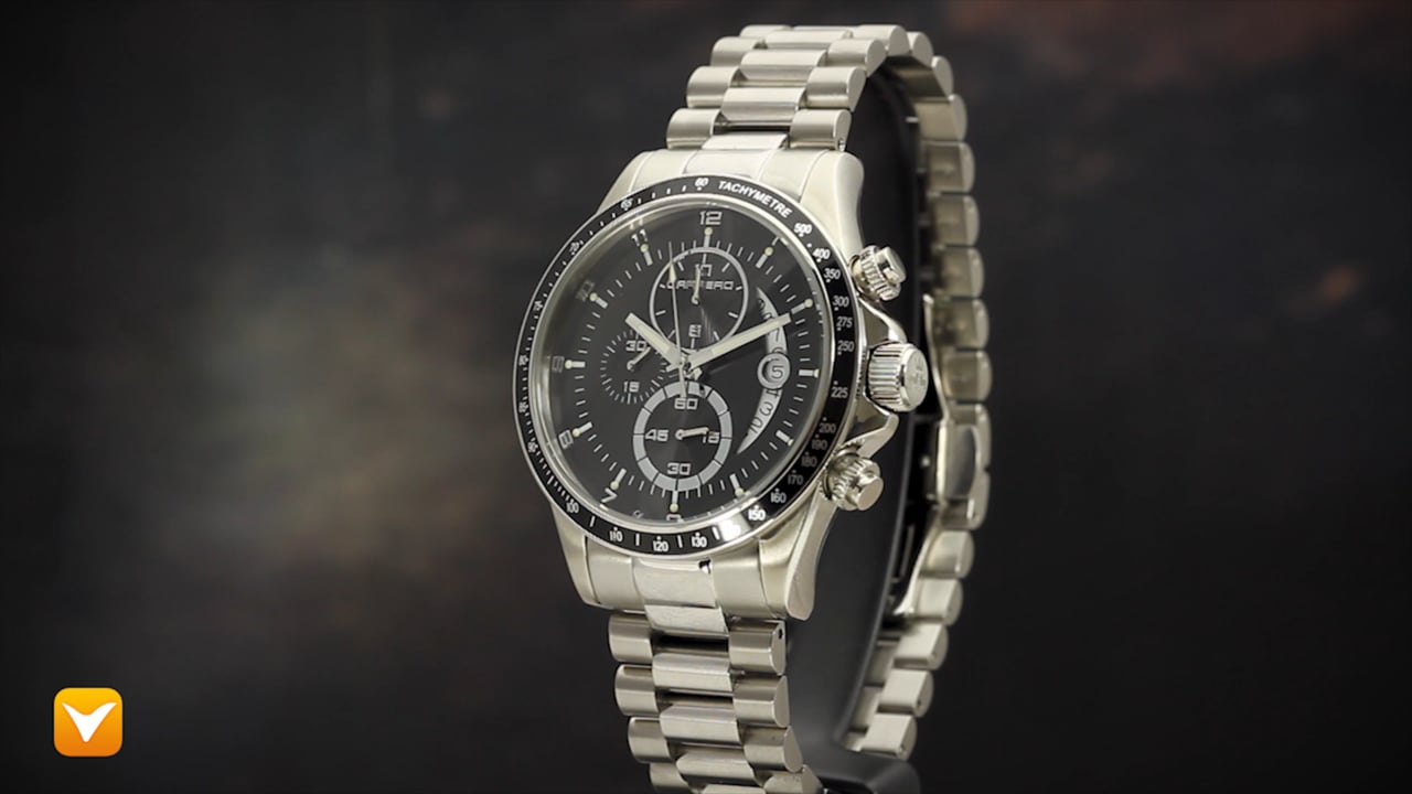 | Brand: Carrero Collection: Catania "Winner's Circle" Gender: Men's Dial: Black Dial Watch Movement: Swiss Made Ronda Chronograph Band Material: 316L Stainless Steel-Fits 8 1/2 wrist Band Width: 22mm Clasp Type: Deployment Watch Case: 316L Stainless Steel with Screw down crown Water Resistant: 100m-330ft Crystal: Scratch Resistant Domed Harden Mineral Bezel: Stationary Case Diameter: 44mm Case Thickness: 11mm |