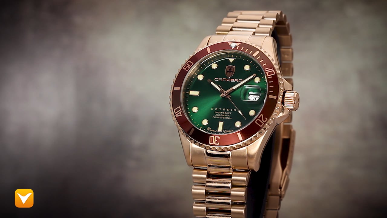 Carrero Limited Edition Catania Diver Automatic Rose Gold Green Dial Maroon Bezel. Price: