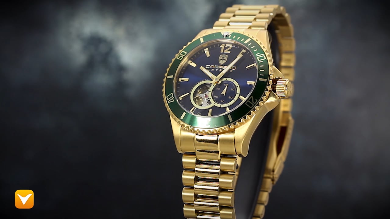 Carrero Limited Edition Catania Diver Automatic Heartbeat Gold Tone Blue Dial Green Bezel. Price: