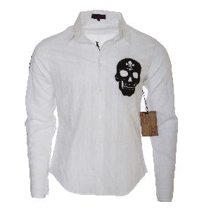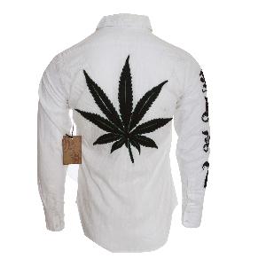 | Make a statement in this Raw 7 mens button up shirt in white. Black skull with flour-de-lis featured on front with large cannabis leaf on back. 100% Cotton By Raw7 |