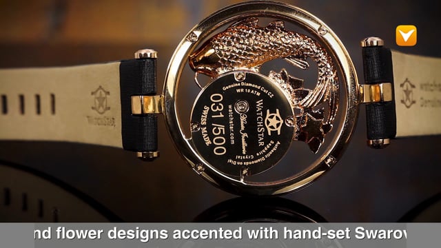| Feature with SOP 656 EBS Swiss movement -- Limited Edition of 500pcs -- 42mm Dial -- 316L Stainless Steel case with animal sculptures and flower designs accented with hand-set Swarovski Zirconia for a unique and spectacular aesthetic -- jewels are 57 facets, diamond cut to meet GIA standard -- A petite mother-of-pearl dial sits off-center in the open case -- sapphire crystal -- Genuine diamond markers -- 20mm color coordinated satin topped leather strap fitting up to an 8.5” wrist, and 100M water resistance. |