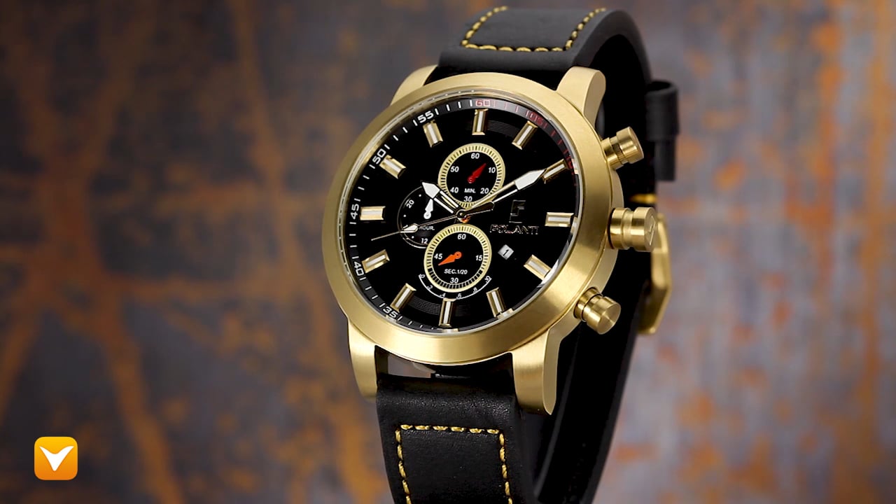 | Polanti Retrograde Chronograph Gold Tone Black Dial Black Leather Strap. Price: $259 | ||