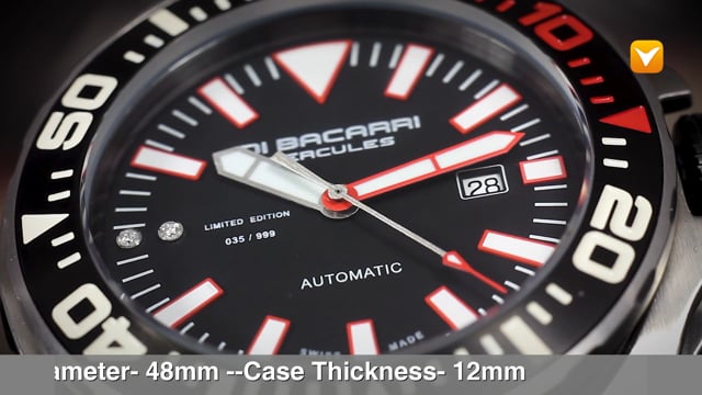 | Brand: Di Bacarri Collection: Hercules Gender: Men's Dial: Black/Red, 2 genuine diamonds on the 9 o'clock hour marker Watch Movement: 25Jewel Automatic-with Quickset Date Band Material: Rubber Band Width: 22mm Fits 8 1/4 wrist Clasp Type: Tang Buckle Manufacturer's Movement Caliber: ETA 2824 Automatic Watch Case: 316L Stainless Steel Water resistant: 50ATM - 500 meters Crystal: Sapphire Crystal Bezel: Uni-directional Diver Case Diameter: 48mm Case Thickness: 12mm |