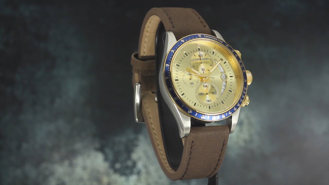 | Carrero Catania R1 SE Limited Edition Swiss Chronograph Two-Tone Gold Dial Blue Bezel Brown Strap. Price: $349 | ||