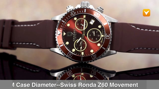Carrero Limited Edition Catania Diver Swiss Chronograph Stainless Steel Maroon Dial Maroon Bezel Brown Silicon Strap. Price: