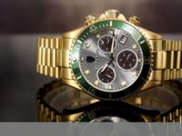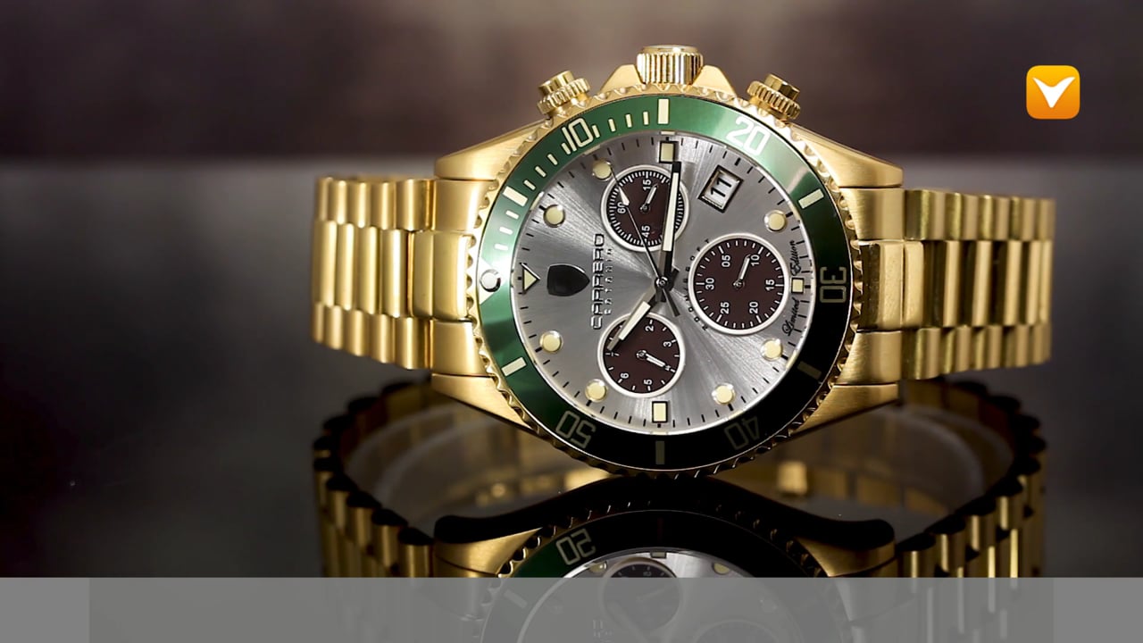Carrero Limited Edition Catania Diver Swiss Chronograph Gold Tone Silver Dial Green Bezel. Price: