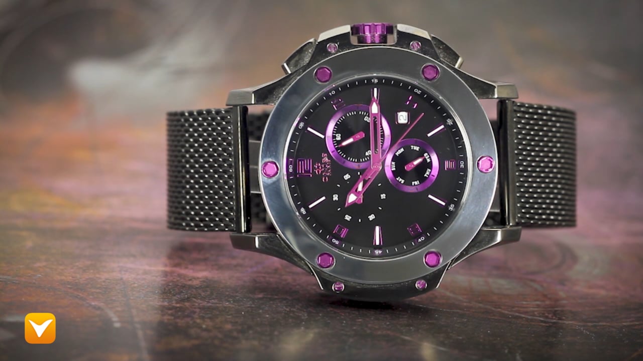 | Oniss Bolt Chronograph Tungsten Black/Purple Dial Black Mesh Band. Price: $329 | ||