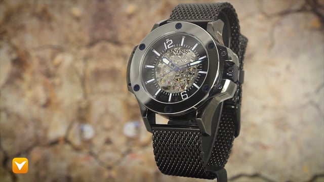 | Oniss Bolt Skeleton Automatic Tungsten Black Dial Black Mesh Band. Price: $399 | ||