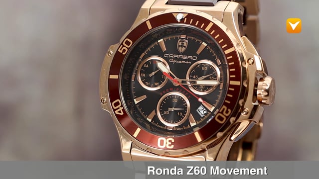 Carrero Limited Edition Aguamar Swiss Chronograph Diver Rose Tone and Ceramic Black Dial Maroon Bezel. Price: