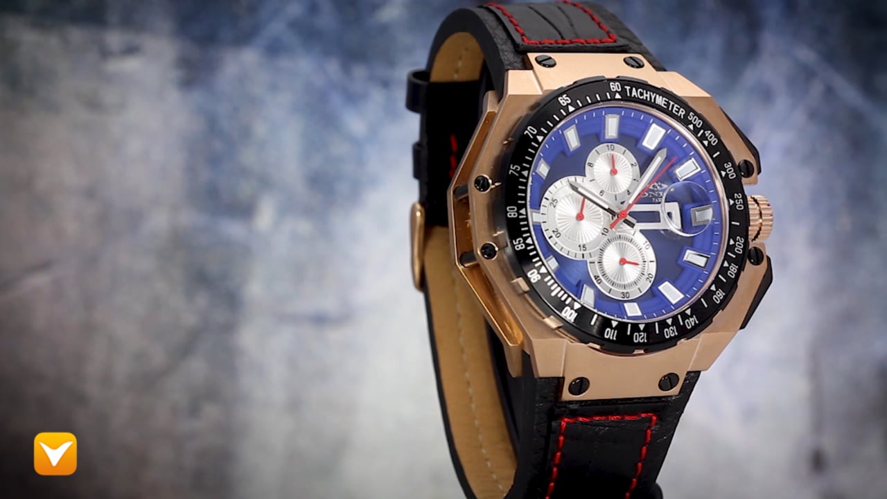 | Oniss Bolt XL Chronograph Rose Gold Blue Dial Black Leather Strap. Price: $299 | ||