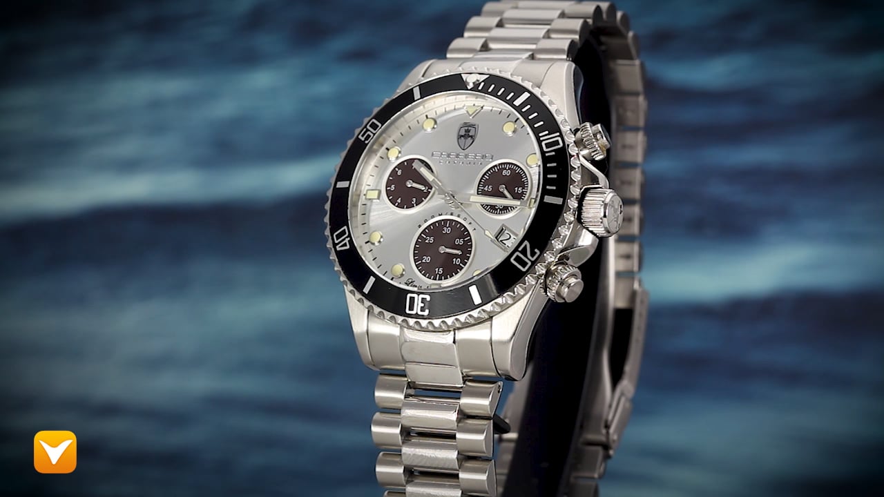 Carrero Limited Edition Catania Diver Swiss Chronograph Stainless Steel Silver/Maroon Dial Black Bezel. Price: