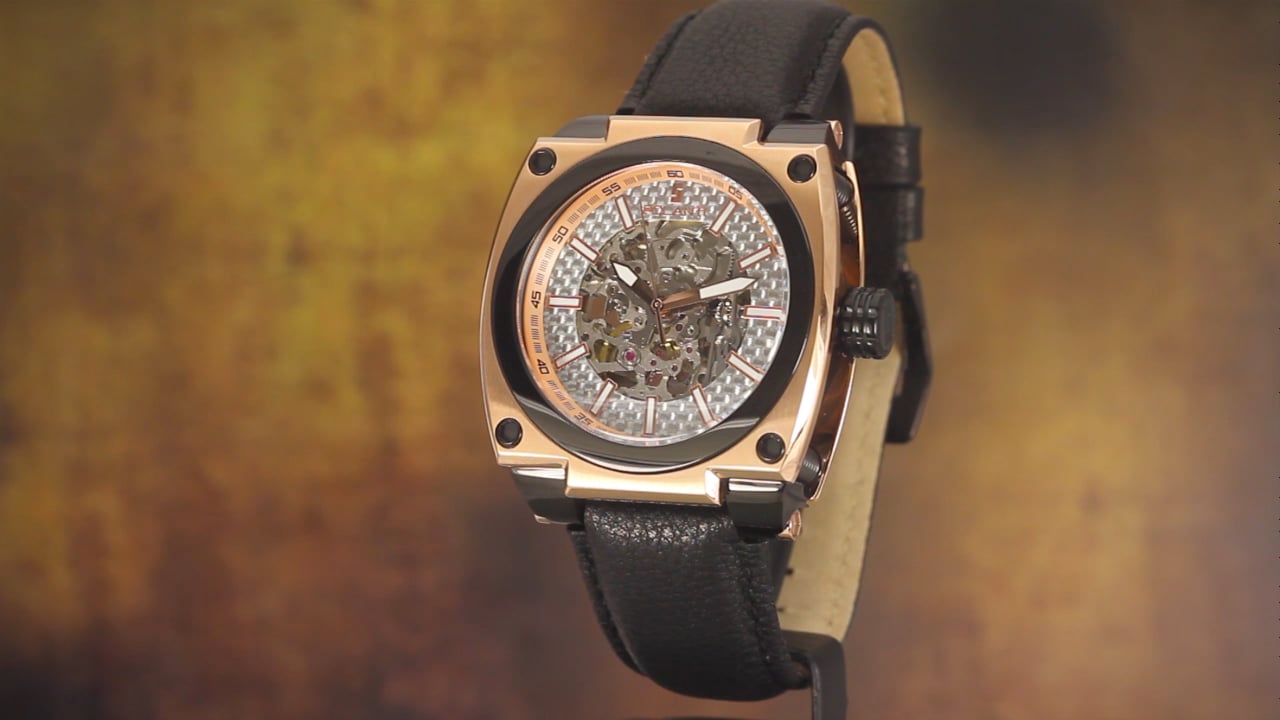 | Polanti Torque G2 Skeleton Automatic Rose Gold/Black Silver Carbon Fiber Dial Black Leather Strap. Price: $499 | ||
