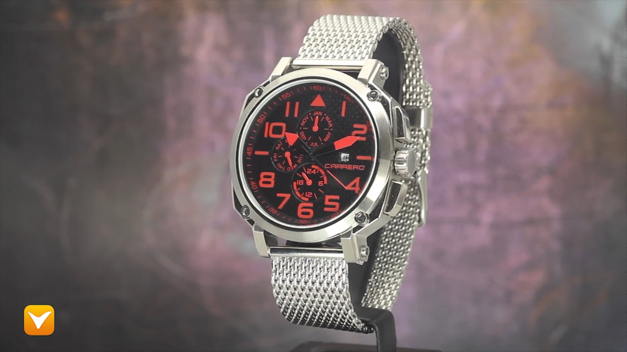 | Carrero Special Edition Swiss Triple Date Black/Red Textured Dial Mesh Band. Price: $269 | ||