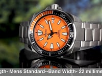 | Item Shape: Round Crystal: Hardlex Clasp: Fold-Over Clasp with Single Push-Button Safety Case Material: Stainless Steel Case Diameter: 44 millimeters Case Thickness: 12.8 millimeters Band Material: Stainless Steel Band Length: Men's Standard Band Width: 22 millimeters Band Color: Silver Dial Color: Orange Bezel Material: Stainless Steel Bezel Function: Unidirectional Calendar: Date Movement: 23 Jewel Automatic Water Resistant Depth: 660 Feet |
