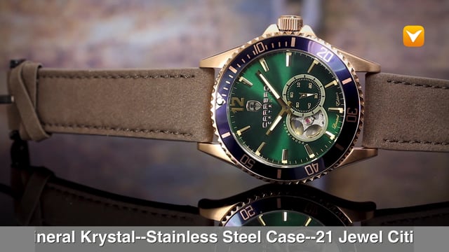 | Carrero Limited Edition Catania Diver Automatic Heartbeat Rose Gold Green Dial Blue Bezel Brown Leather Strap. Price: $399 | ||