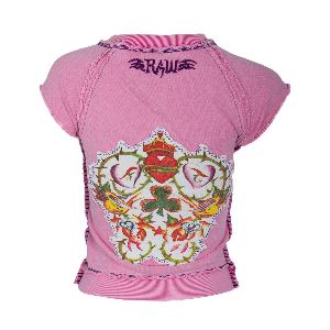 | A true RAW7 Original, this cut off short sleeved v-neck sweatshirt in pink features string stitching and spiked crowned heart and clover theme variation with embroidered RAW7 logo on back. 100% Cotton |