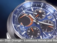 | Band: Stainless Steel Deployment Clasp with Push Button Dial: Orange, Luminous Hands and Markers Case: Stainless Steel Crystal: Anti-Reflective Sapphire Crystal Functions: 1/5 Second Fly back Chronograph Measures up to 12 Hours - Alarm -Power Reserve Indicator -Hand Assembled Movement - Date Case Size: 45mm Water Resistant to 200m Swimming, Showering and Snorkelling |