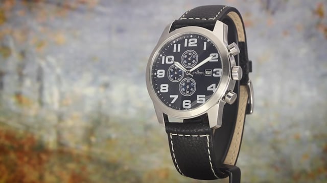 | Watch Information Brand: Le Chateau Mineral Crystal Clasp: Buckle Case Material: Stainless Steel Case Diameter: 46 millimeters Band Material: Leather Band Length: Men's Standard Band Color: Black with White Stitching Dial Color: Blue Calendar Date Movement: OS10 Chronograph Quartz Water Resistant Depth: 30 Meters |