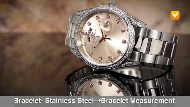 | Watch Details •Movement: Quartz Day Date •Case Measurements: 42mm •Thickness: 12mm •Case Material: Stainless Steel •Bezel: Fixed •Crystal: Mineral •Dial Material: Rose •Crown: Screw Down •Complications: 3:00 - Date and 12:00 - Day of the week •Bracelet: Stainless Steel •Bracelet Measurements: 7-3/4 inches L x 22mm W •Clasp: Push Button Deployant •Water Resistance: 5 ATM - 50 meters - 165 feet |