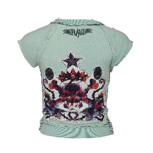 | A true Raw7 Original, this cut off short sleeved v-neck sweatshirt in green features black stitching and crowned skull design on back. 100% Cotton |
