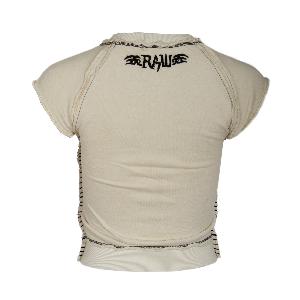 | A true RAW7 Original, this cut off short sleeved v-neck sweatshirt in beige features black stitching with winged rose theme on front and dark purple embroidered RAW7 logo on back. 100% Cotton |