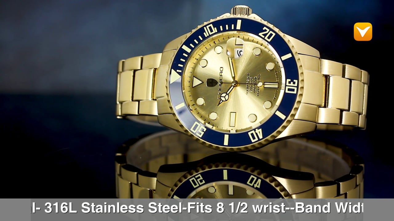 | Carrero Submersion Limited Edition Automatic Gold Tone Gold Dial Blue Ceramic Bezel. Price: $389 | ||