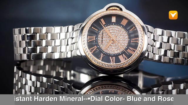 | Watch Details •Crystalite Stones : All Hand-Set-160settings (100 on the dial and 60 on the bezel) •Movement: Swiss Ronda •Case Measurements: 38mm •Thickness: 10mm •Case Material: Stainless Steel •Bezel: Stationary •Crystal: Scratch Resistant Harden Mineral •Dial Color: Blue and Rose Gold •Crown: Push Pull •Band: Stainless Steel •Band Measurements: 7-7/8 inches L x 18mm W •Clasp: Deployment •Water Resistant: 5 ATM - 50 meters - 165 feet |