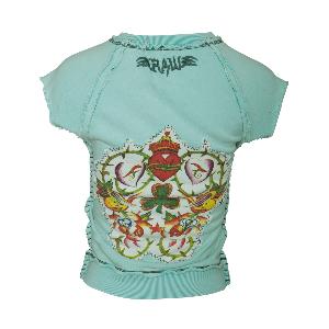 | A true RAW7 Original, this cut off short sleeved v-neck sweatshirt in lagoon green features string stitching and spiked crowned heart and clover theme variation with embroidered RAW7 logo on back. 100% Cotton |